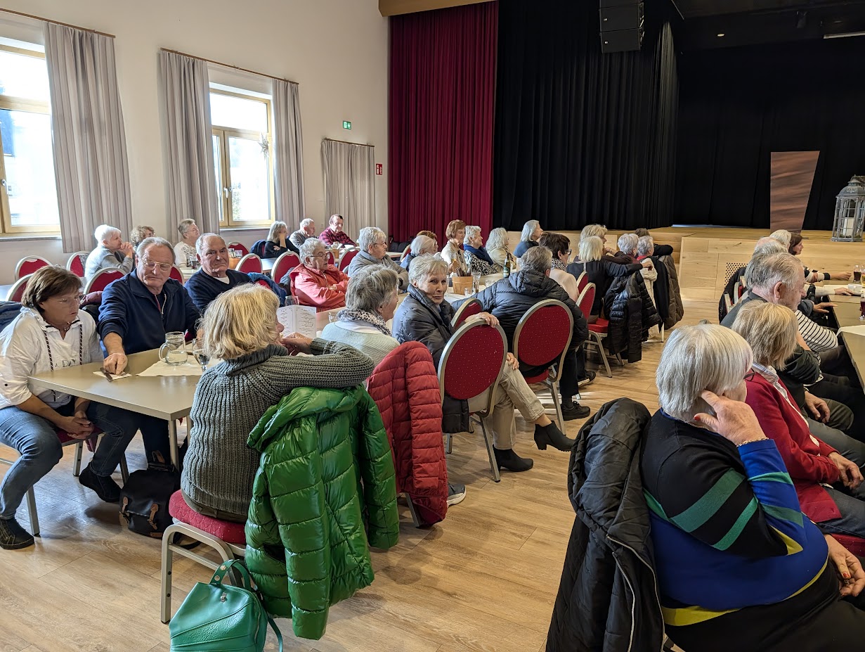Wie jedes Jahr, war auch heuer das Interesse an der Fahrt ins Blaue groß. Am Mittwoch benötigten wir zwei große Busse, am Donnerstag fuhren 54 Personen mit. Nach kurzer Fahrt nach Sipbachzell erreichten wir um ca. 10 Uhr unser Tagesziel – das Gasthaus Zirbenschlössl im Gewerbepark Ost. Ab 11 Uhr hatte der Zauberkünstler Alexander Just vom Verein „Hokuspokus“ aus Leonding seinen Auftritt. Er beeindruckte uns mit vielen Tricks und auch das Publikum wurde zu zahlreichen Nummern auf die Bühne geholt. Das Mittagessen wurde ab 12 Uhr serviert und schmeckte sehr gut. Von 13 bis 15.45 Uhr wurden wir von Alleinunterhalter Roland musikalisch verwöhnt. Die angenehmen Darbietungen, quer durch alle Genres, animierten uns zum Mitsingen und das Tanzbein wurde fleißig geschwungen.