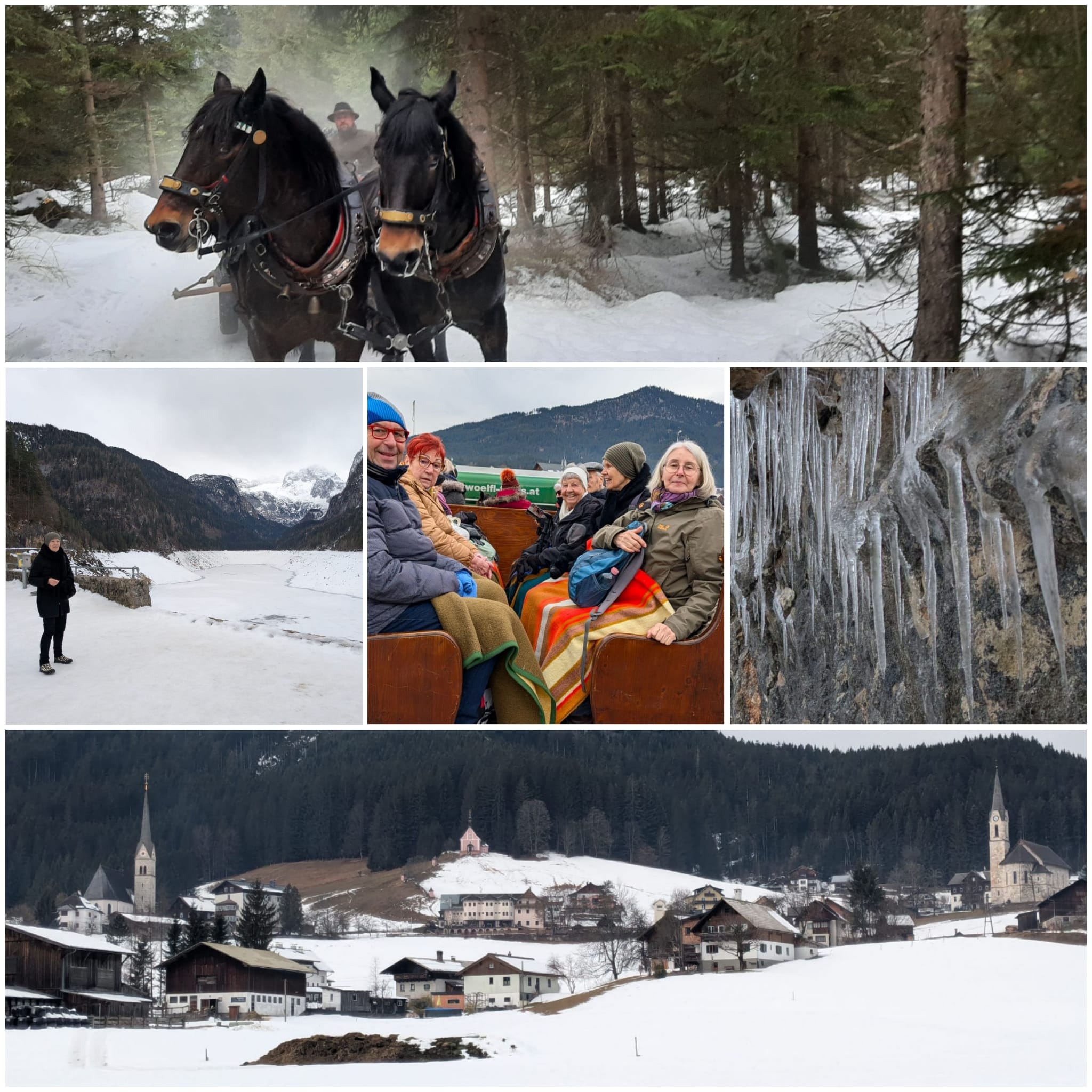 11.02.2026: Chauffeur Gerald Dannerbauer von Platzl-Reisen hat 49 Mitglieder über Bad Ischl und Bad Goisern nach Gosau gebracht. Beim Sportplatz Gosau-Mittertal ließ unser aufmerksamer Chauffeur die Wanderer und Pferdeschlittenmitfahrer aussteigen. Diesmal waren unsererseits keine Langläufer dabei. Die Wanderer genossen das weitläufige Tal, während einige unserer Gruppe nach Lokalitäten zwecks einer Einkehr Ausschau hielten. Dieses Jahr führten uns die Kutschen aufgrund vorhandener Schneelage wieder in den Wald. Der Bus brachte die Schneeschuhgeher und die Alpinisten zur Talstation der Zwieselalm. Zwei Skifahrerinnen genossen dort die gut präparierten Pisten, während weitere 2 Mitglieder mit dem 8- er-Jet zur Zwieselalm fuhren, um den Schneeschuhtrail zu erkunden. Um 11.50 Uhr fuhren die Pferdeschlittenfahrer und alle Wanderer mit dem Bus etwa 8 km zum Gasthof Gosausee. Nach einem köstlichen Mittagessen a la carte machten viele einen Spaziergang um den Gosausee, der aufgrund von Stromgewinnung dieses Mal enorm abgesenkt war. Die Sonne war an diesem Tag wenig zu sehen.  Wir haben den Tag sehr angenehm empfunden, weil aus der Bewölkung während unseres Aufenthalts keine Niederschläge kamen. Die Bergwelt mit Donnerkogel und Dachsteinmassiv wirkte diesmal wiederum beeindruckend. Zurück im Gasthaus Gosausee gab es Kaffee und süße Mehlspeisen. Gegen 16.00 Uhr machten wir uns auf den Heimweg, um auch die Schneeschuhgeher und Schifahrer aufzunehmen. Der Tag war voller Aktivitäten und guter Laune, an den wir uns gerne erinnern werden.      Leo Zöserl